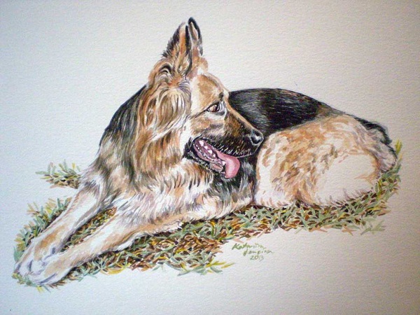 The glossy tone of this fine (and attentive) German Shepherd is beautifully revealed by the water colour technique.